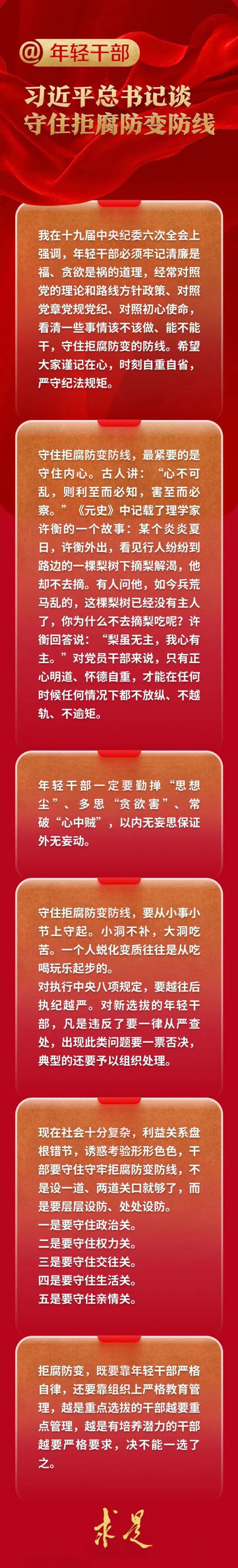 在《求是》杂志近期刊发的习近平总书记重要文章《努力成长为对党和人民忠诚可靠、堪当时代重任的栋梁之才》中,总书记强调:“年轻干部必须牢记清廉是福、贪欲是祸的道理”,“守住拒腐防变防线”。