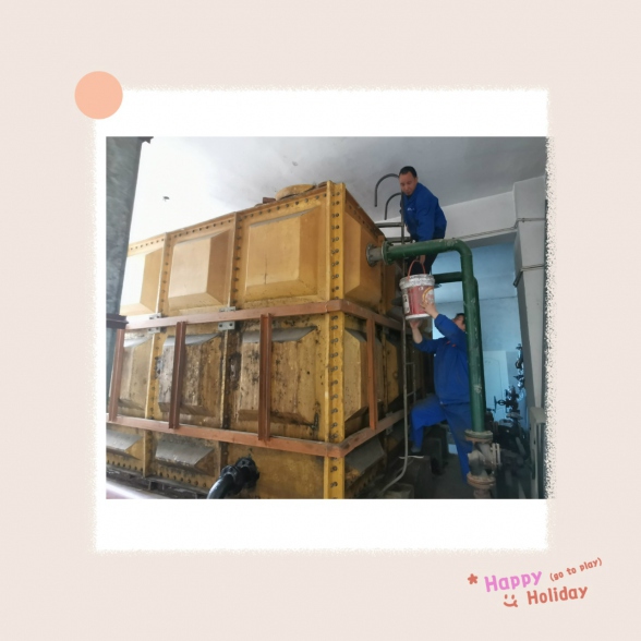 修补裂缝需要从水箱顶部的圆形维修孔进入到箱体内部进行作业。水箱3米多深,里面潮湿黑暗,又不通风,十分的憋闷。张继芳师傅考虑2位年轻同事经验和技术不足,不能很快解决问题,于是他不顾自己60多岁年纪,带领近60岁的赵明明老师傅--公司的老标兵,亲自下到水箱内部进行作业。他们打着手电在水箱里面沿着四壁和每个转角一点点、一片片的排查问题点,发现裂隙就及时做好标记。由于里面空气不流通,不能久呆,他们就每隔一会工作一段时间要出来透透气,再钻进去继续作业。这样多次反复的爬上爬下、爬进爬出对两位老师傅来说也是一件比较消耗体力的事。但是考虑到时间紧,操作流程多,还不能长时间停水影响晚上各部门的营业,他们俩一直都不敢怠慢,顾不上擦脸上的汗,顾不得喝口水或歇下来抽支烟解解乏,两位老师傅在计划的时间内,一鼓作气完成了修补裂缝的工作。看到他们最后从维修孔满脸疲惫的钻出来身来,周围同事都不禁激动的鼓起了响亮的掌,有人赶忙端上了热水,有人赶忙递上了毛巾、点上了烟,欢笑声顿时洋溢满小小的设备室内。