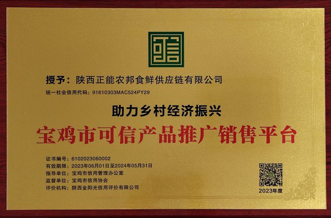 信用是企业生存和发展的基石,党的十八大以来,党中央、国务院高度重视社会信用体系建设,把加强社会信用体系建设上升到推进国家治理体系和治理能力现代化的高度来抓。宝鸡市国有资产经营有限责任公司作为宝鸡市信用协会副会长单位,长期以来高度重视信用体系建设工作,坚持把信用体系建设融入公司体制建设、经营管理、文化建设,坚持诚信治企,将信用元素引入到生产经营全过程,为宝鸡经济社会高质量发展保驾护航。 近日,公司直管企业陕西正能农邦食鲜供应链有限公司喜获“助力乡村经济振兴,宝鸡市可信产品推广销售平台”荣誉。