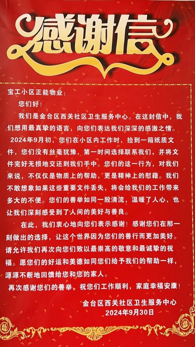近日,宝鸡国资正能实业发展有限公司宝工小区物业办,收到了来自金台区西关社区卫生服务中心送来的“优秀团队 品德高尚”字样的大红锦旗,以及一封饱含深情的感谢信。这一切源于一次看似平凡的日常保洁工作,保洁员在打扫卫生时意外捡到了社区医院遗失的重要文件,并及时归还,这一行为不仅体现了员工的专业素养和服务态度,更展示了正能实业团队的伟德bv1946官网和底蕴,员工用实实在在的行动和举措赢得了信任与赞誉。 未来,正能实业公司将一如既往地做好各项物业服务工作,继续为民解难事,以情暖人心,用最真诚、最专业、最高效的服务对待每一位业主,践行国企的责任和担当,以匠心铸品质,以品质树标杆,为业主打造一个安心,舒心,放心的美好家园。 |